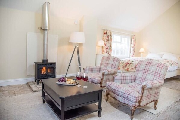 Nestled in the grounds of Mill House, Mill Cottage offers a serene escape. This charming studio boasts a log burner, kitchen, king-size bed with quality linens and Netflix on the TV. Outside you can unwind by the wild swimming pond or relax in your private garden area with reclining chairs.