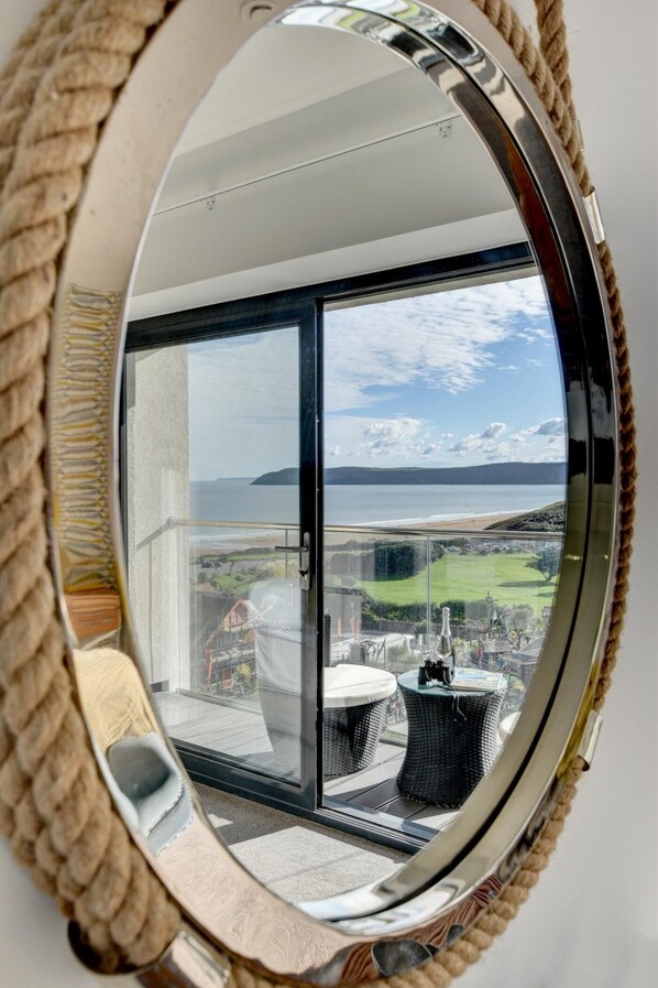 This bright apartment enjoys plenty of light and glorious views from the large windows from its elevated position on the first and second floors. Accessed via 4 steps, guests enter the apartment into the open-plan kitchen/lounge/diner. There is a modern kitchen, a relaxed dining table and comfortable seating that looks out through the sliding balcony doors across the bay. On the first floor, you will also find the single bedroom and the family bathroom with a walk-in shower and heated towel rail. Upstairs are the well-presented, king-size and twin bedrooms, with an en-suite bathroom for the king-size bedroom. Here you will also conveniently find laundry facilities.