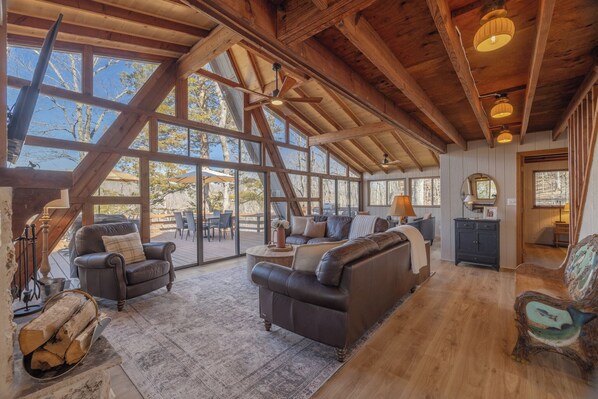 • Roomy living area with a brand new TCL Roku smart TV pre-loaded with all the necessary apps for movie nights and entertainment, stone fireplace, recently updated furniture, cozy sitting area, and a wall of windows that offer a scenic, four seasons view of the outdoors that can be seen throughout the interior