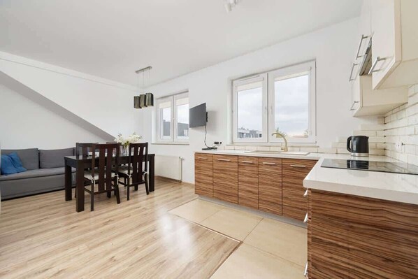 This spacious 32 m² studio apartment can accommodate 2 people. Ideal for a business trip or a romantic getaway for two. It consists of a living room with a double sofa bed, a kitchenette, a bathroom with a shower and a balcony. The decor of the apartment is very cozy and homely, personalized by finishing with subtle decorations and stylish furniture. There is a balcony with garden furniture, where you can relax with a morning cup of tea or coffee in the fresh air. The apartment is equipped with a flat-screen SmartTV (+ cable TV) and free Wi-Fi. A wide range of bathroom and kitchen amenities (including a washing machine, dishwasher and ironing equipment) meet the needs of our guests during their travels. The property is an ideal choice for anyone who appreciates comfort and functionality, but also aesthetics. Complimentary toiletries, linens and towels are provided to facilitate the start of each stay.