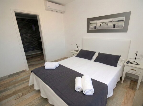 The villa consists of 3 bedrooms; one double bedroom with 1.50m x 1.90m bed and en suite bathroom, two bedrooms with 2 single beds each. There is a second bathroom.