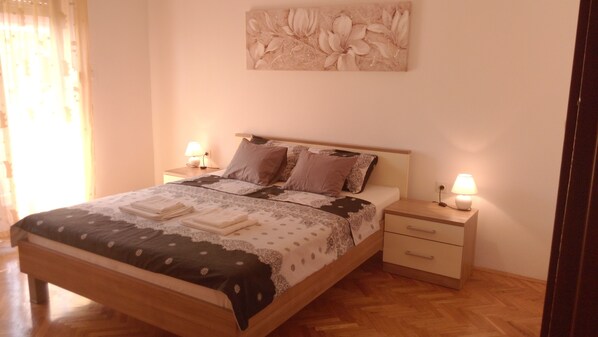 Apartman Sunset is a spacious, comfortable and air-conditioned apartment. It has two rooms, one with a double bed and the other with three beds. The living room has TV and free Wi-Fi access and exits to the terrace.