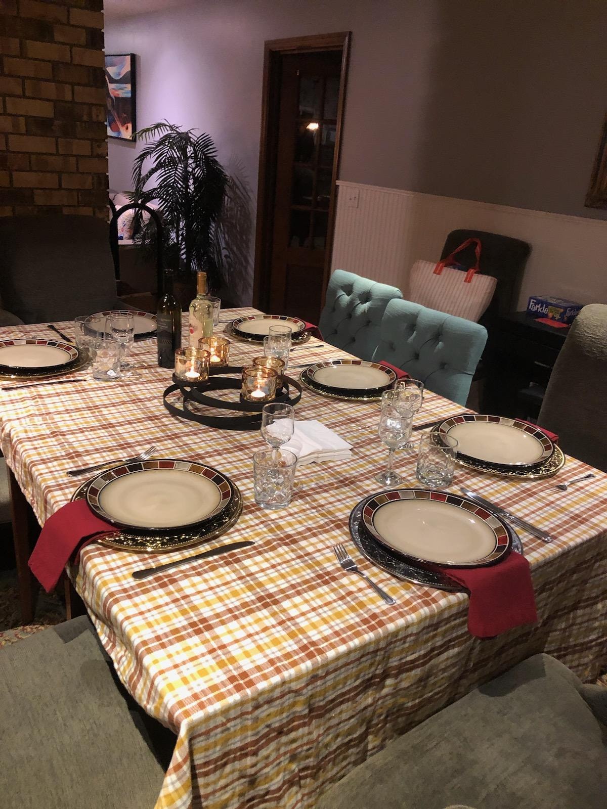 There are two tablecloths- white and white w/two long strands of olive branches, for use on the ping pong table. Ten people sit comfortably around it under the twinkling lights when weather co-operates! (There is a room heater and curtains do close to block windy conditions. Seating for 10 is very rare in rental homes~