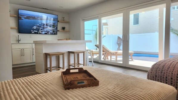 PROPERTY LAYOUT 1ST LEVEL: - 2 bedrooms (1 twin bed with twin trundle and 1 full bed) - 1 newly renovated full bathroom with a stand up shower and double vanity - Indoor lounge area with a wet bar, 2 TV's and comfortable seating overlooking the pool and patio - Access to the pool through beautiful full glass sliders