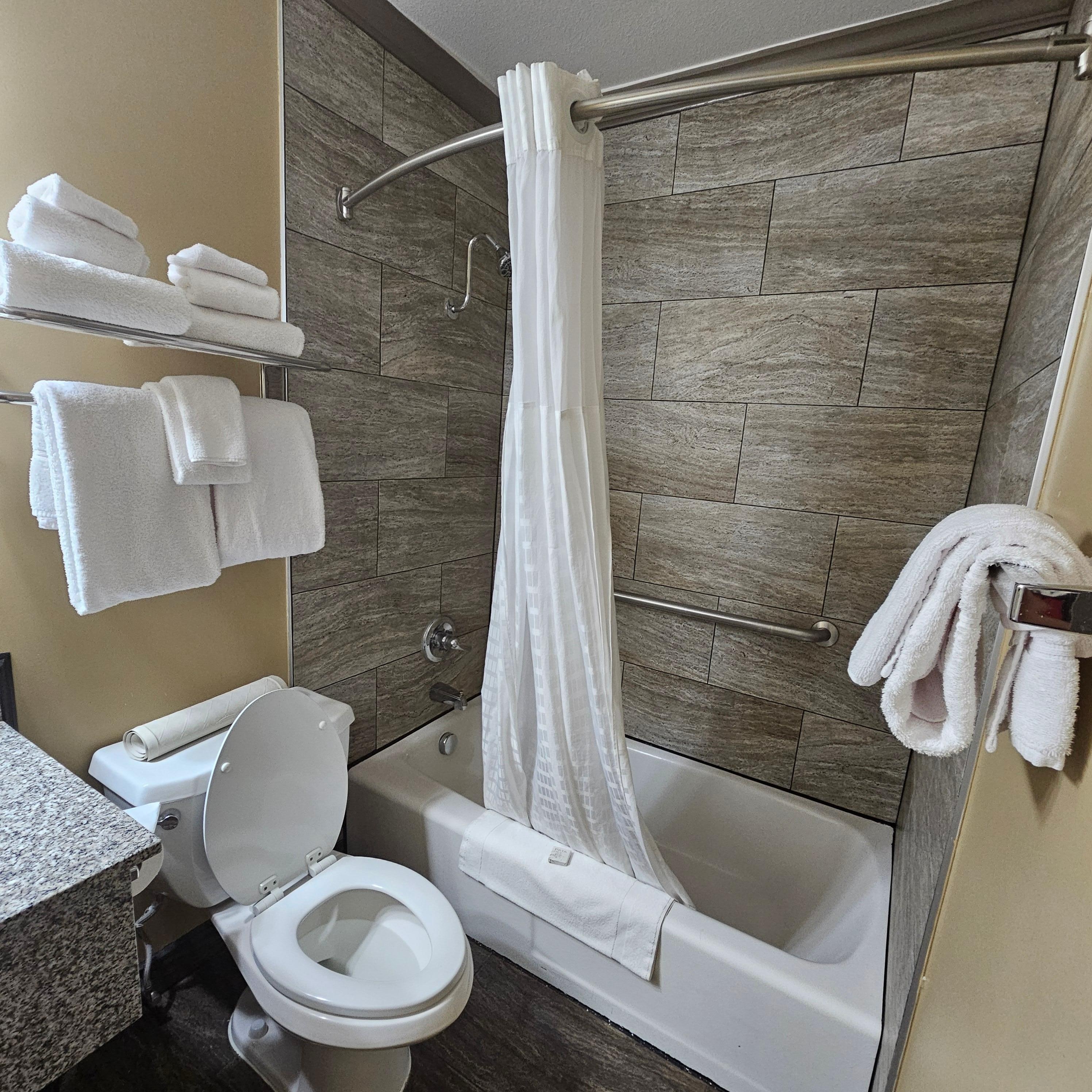Bathrooms with eco-friendly toiletries and shower/tub combinations