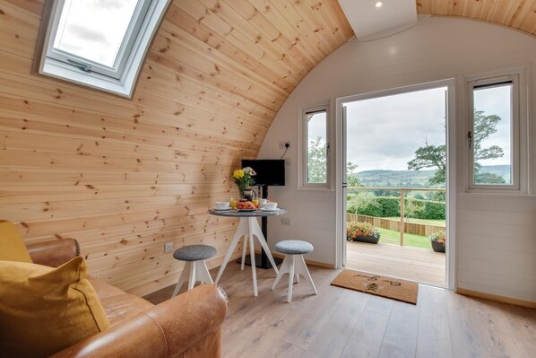 A glamping pod, set in the idyllic East Devon countryside, next to the owners own home with wonderful views over the rolling hills. The pod consists of a open plan living area with kitchenette and cosy seating area with two seater sofa, TV and a double bed situated behind. There is a seperate shower room with toilet and washbasin. With the added benefit of underfloor heating throughout, guests can enjoy this wonderful location all year round.