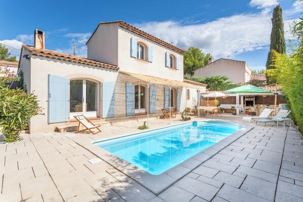 - a garden with a private swimming pool (3.5x8m), a large terrace with barbecue and large table, deckchairs and a relaxation area,