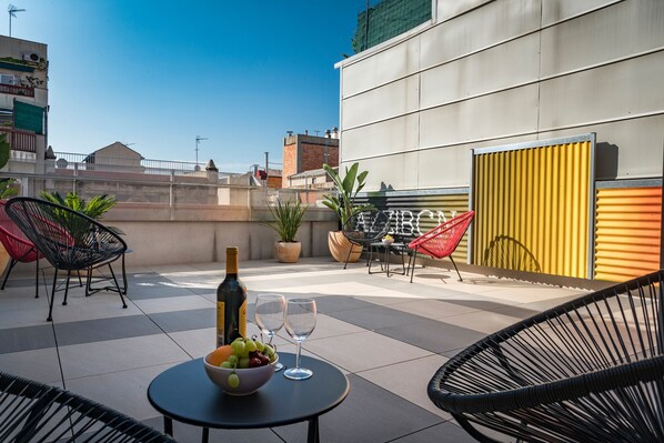The Terrace that can be seen in the images, is shared, is located on the roof of the building and its opening hours are subject to change.