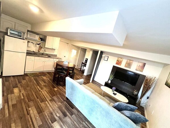 Unit Features: - One-bedroom, one-bathroom layout with a cozy living area. - Equipped kitchenette with a **single electric burner** (note: **no full stove or oven**). - One queen-size bed with fresh linens and hotel-style comfort. - Self check-in via secure keypad for your convenience. - Professionally cleaned and sanitized before every stay. - Shared washer and dryer available in the basement. - Pets are not allowed.