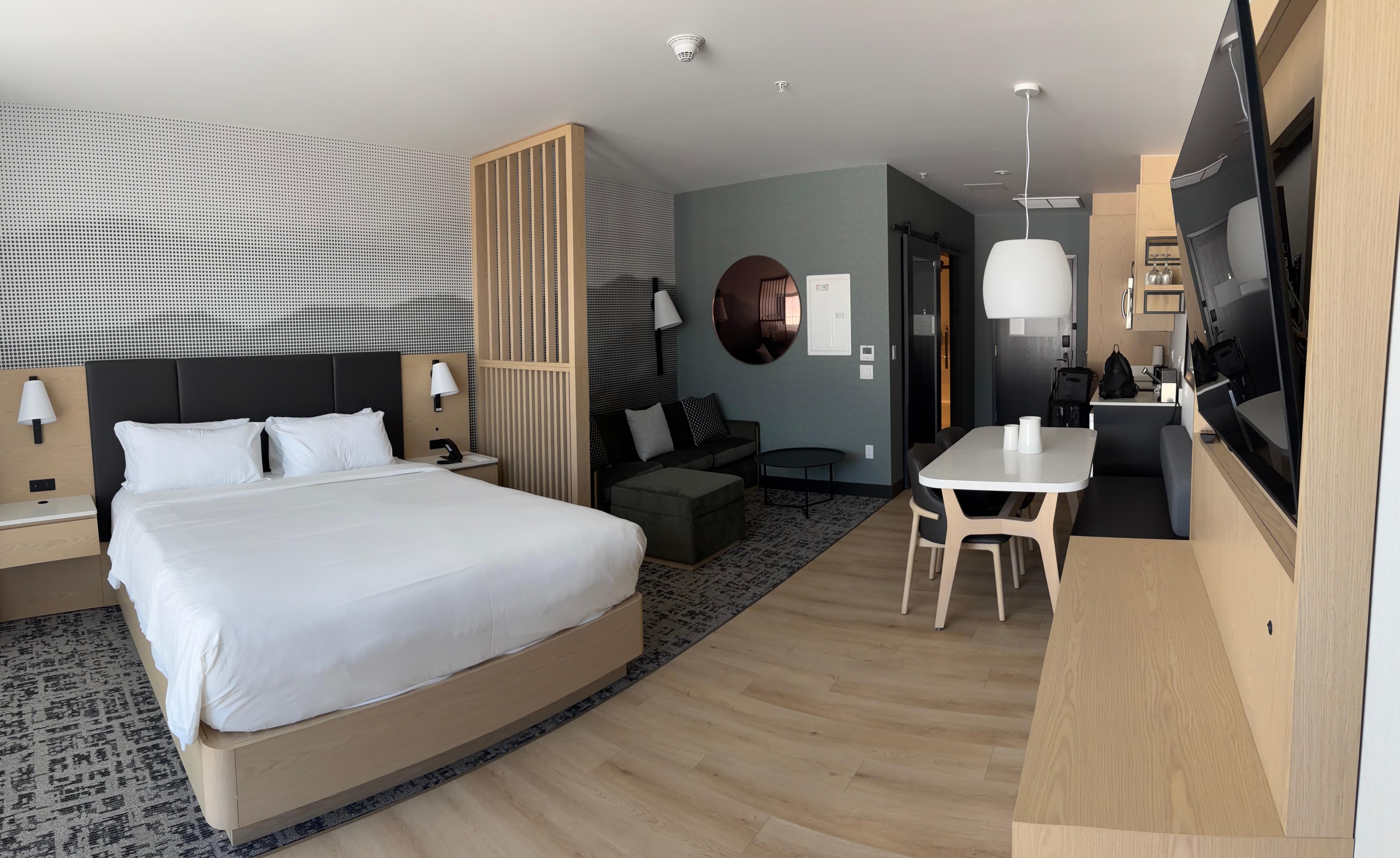Loved this hotel. It’s new and very clean. The ensuite kitchen was great for snacks and easy lunches. I would suggest a glass casserole dish for the microwave. Table and chairs allowed us to play cards in the evening in the room. Bed was comfortable and shower great.