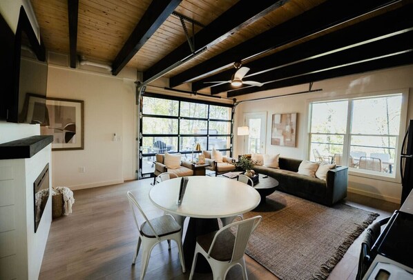 White Pine cabin contains the most distinctive layout as well as many special features that will ensure your stay is amazing! The first floor entryway leads to two queen bedrooms and one full bath. Both bedrooms have access to a private covered deck. Venture down to the lower level to be awed by the glass garage doors which highlights the open kitchen and living space. Open the doors to bring the outside in, or keep them shut for full views of the wooded landscape. Hot tub included!