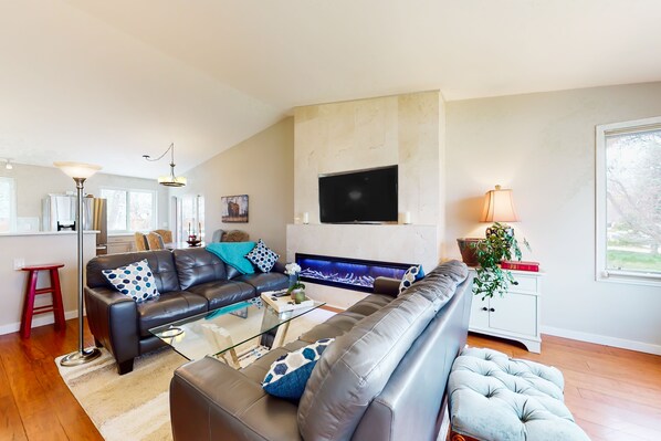 The home's main living space is upstairs, bringing together a light-filled living room with two sofas and a smart TV, a dining area, and a well-equipped kitchen with stainless steel appliances. In addition to the rec room downstairs, there's also a home office complete with a desk setup for two, monitors, printers, and complimentary WiFi. Of the three bedrooms, one is a primary suite on the main floor with its own TV, bathroom, and access to the backyard. Lawn maintenance takes place on Mondays