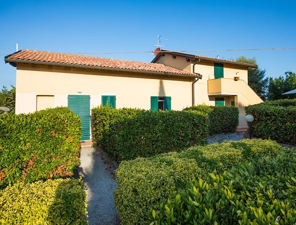 This vacation rental features a private outdoor area with a terrace and barbecue. Guests also have access to a shared outdoor area with a fenced pool (open from June 1 to September 20, from 8:30 a.m. to 8:30 p.m.), garden, and outdoor shower.