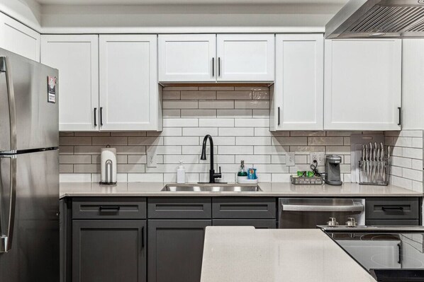 The spacious chef style kitchen is fully stocked with all essentials, making it easy to prepare meals at home. The serene bedroom features a queen memory foam mattress with luxury linens and plush pillows to help you rest peacefully.