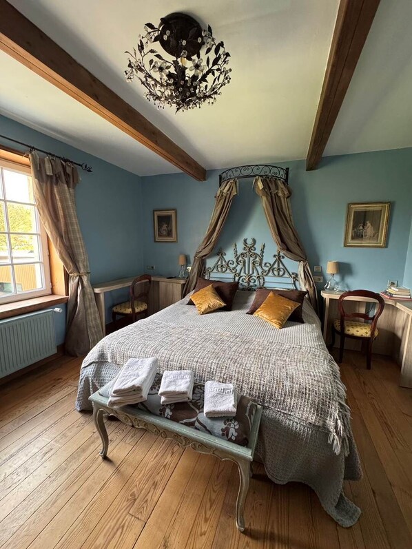 Travelers find tranquility at Clos de Tournes in Bolonnais. The Blue Room offers a breathtaking view, and breakfast includes homemade jams, fresh bread, and pastries. Host Caroline introduces regional specialties. The property has cable TV and is smoke-free.