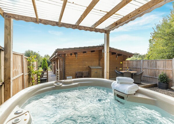 Escape to the Shropshire countryside and unwind at Queens Lodge, where modern comforts blend with rustic charm. Enjoy a peaceful retreat in a spacious open-plan lounge/kitchen/dining area or relax in the secure garden with an outdoor hot tub. With French doors leading onto a verandah and barbecue area, this luxury lodge is perfect for couples or families looking to kick back.