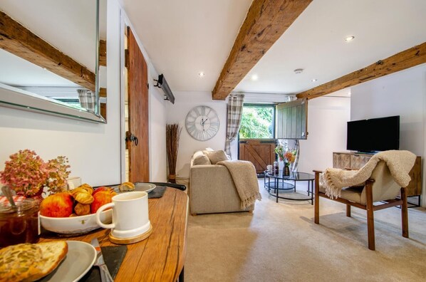 Entering this bright and inviting apartment, you will be greeted by the cheery, light and airy open-plan lounge/kitchen/diner. Charmingly furnished, the room has original wooden ceiling beams and makes an ideal space for you both to snuggle up and relax after a great day out. The central lounge area has comfortable seating and a Smart TV, with a dining table over to the side and a fully equipped kitchen to the rear. Exploring this cosy hideaway further, you will find a bright and relaxing king-size bedroom with an invigorating en-suite shower room. Please note, some of the ceilings are quite low.