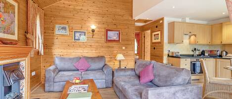 Superb lodge with one master double with en suite shower, one double and one twin. Contemporary bathroom with bath and overhead shower. open-plan living space featuring a large comfortable lounge and spacious well-equipped kitchen with elegant dining area. Patio doors leading to verandah – perfect for al fresco dining. An ideal lodge for large groups or families.