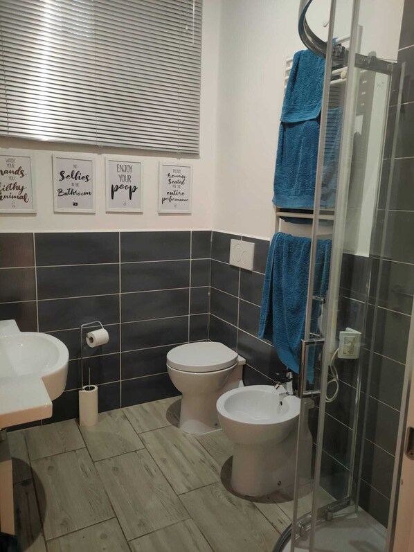 - Bathrooms with bidets and tubs or showers