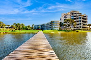 Cozy waterfront condo with central AC, beach access, on-site pool