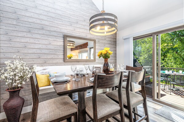 Escape to this inviting family retreat, accommodating up to eight guests in comfort. The first-floor king bedroom, located off the main hallway, features a cozy window seat, ample storage, a smart TV, and an en-suite bathroom. The bright, airy family room on the main floor boasts vaulted ceilings, a TV, a fireplace, and a dining area with seating for eight. Large windows frame a private, tranquil view. Step through the sliding door from the dining area onto a brand-new (2025) screened-in covered deck with cozy seating—perfect for expanding your living and entertaining space. The fully equipped kitchen has everything you'll need, including a full-sized fridge, electric stove and cooktop, dishwasher, coffee maker, toaster, and even a blender for your favorite blended beverages.