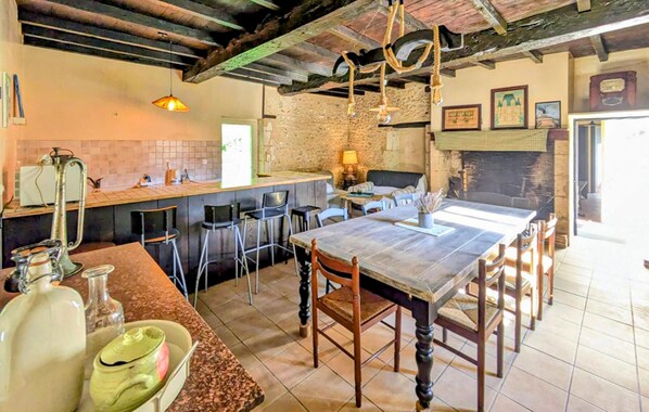 Exposed wooden beams and natural stone walls await you in the living area. The furnishings are simple but practical, so you'll find all the important amenities you need for an uncomplicated stay. Prepare meals in the open-plan kitchen with counter and enjoy your meals at the large dining table. Afterwards, relax and socialise on the sofas.