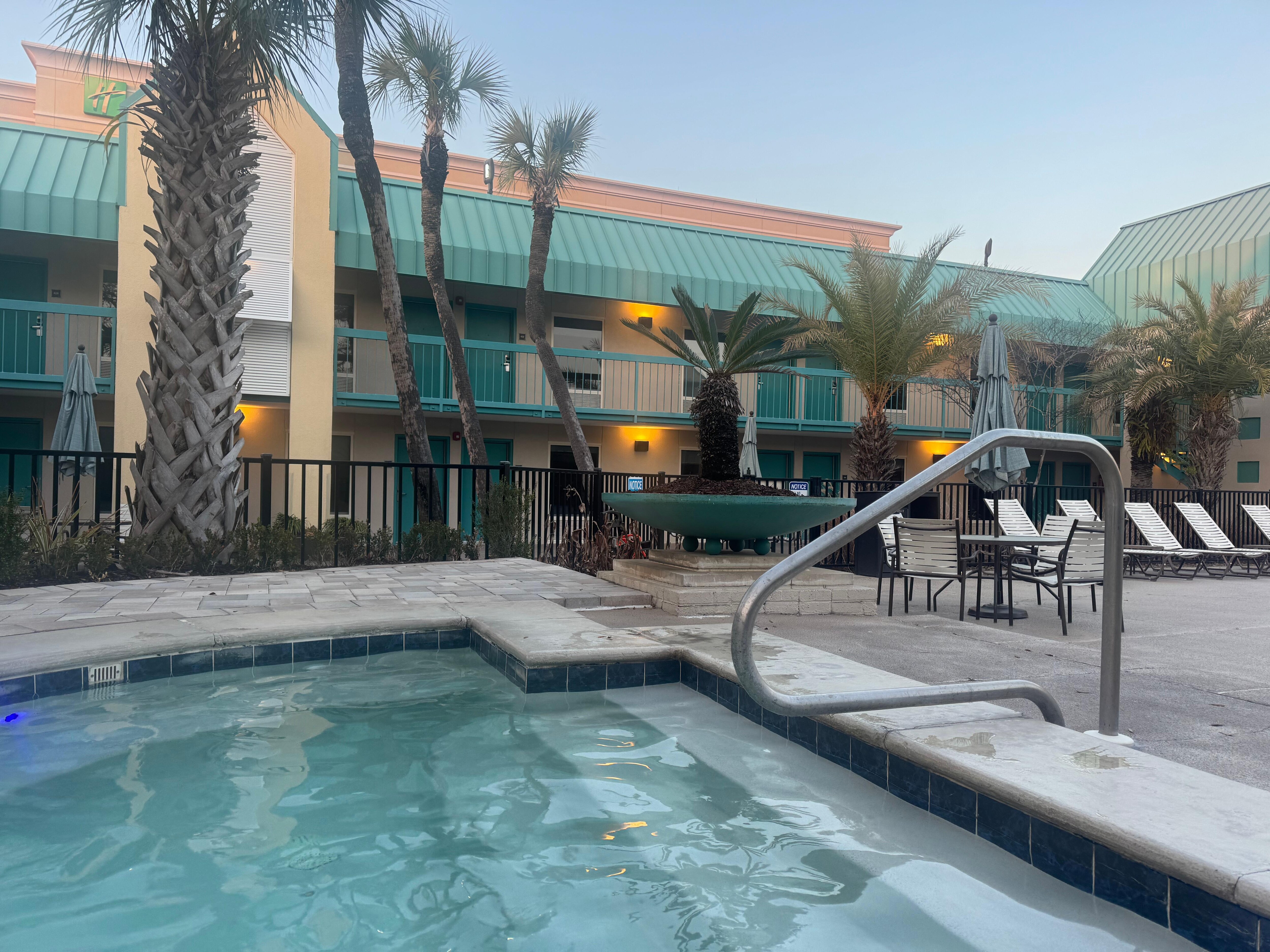 حمّام سباحة خارجي، مظلات على حمّام السباحة، مقاعد للتشمس