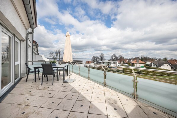 Pros: Die Ferienwohnung befindet sich im Ortskern direkt am See. Das Highlight der Wohnung ist die Terrasse,(ausgestattet mit einem Esstisch, zwei Stühlen und zwei Sonnenliegen) mit direkten Blick aufs Wasser. Die Ferienwohnung ist ruhig gelegen aber befindet sich trotzdem an der Promenade wo zahlreiche Restaurants und Café‘s zum verweilen und entspannen einladen. Ca 500m entfernt befindet sich ebenfalls ein Lidl und Rossmann.