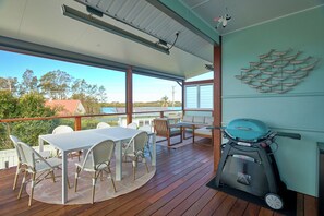Step out onto the back deck to take in stunning river views. This peaceful area is furnished with a large dining table, perfect for alfresco dining, and ceiling-mounted heaters to ensure year-round comfort. Enjoy privacy with pull-down blinds, and make use of the bar fridge and Weber BBQ to enhance your holiday experience.