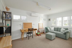 This charming rental offers two spacious bedrooms located on the upper level, with each room boasting a large king bed. The master bedroom is a true parent's sanctuary, featuring its own private lounge and TV, along with ample storage space. On the lower level, you will find a tranquil office nook that doubles as an additional sleeping area. It includes a queen Koala sofa bed, providing comfortable accommodation for two more guests. Linen is provided for guest convenience.