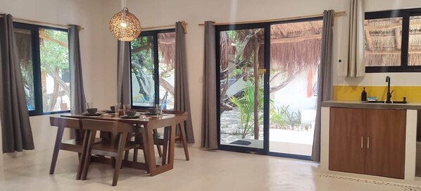 Your private Casa is designed for both comfort and productivity, offering two queen-size beds and a private patio for outdoor dining or relaxing. The space is fully equipped with a kitchen featuring a refrigerator, microwave, toaster, and purified water, as well as a spacious bathroom with hot water, air conditioning, a safe box, iron, and hairdryer.