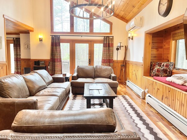 Step inside this warm, light-filled cabin with natural pine ceilings and a stunning floor-to-ceiling stone gas fireplace. The living area is comfortably furnished with leather seating, vaulted ceilings, and a Smart TV. French doors lead to an expansive deck with Trex dining furniture. A private hot tub is surrounded by woods — perfect for relaxing after a day of adventure.
