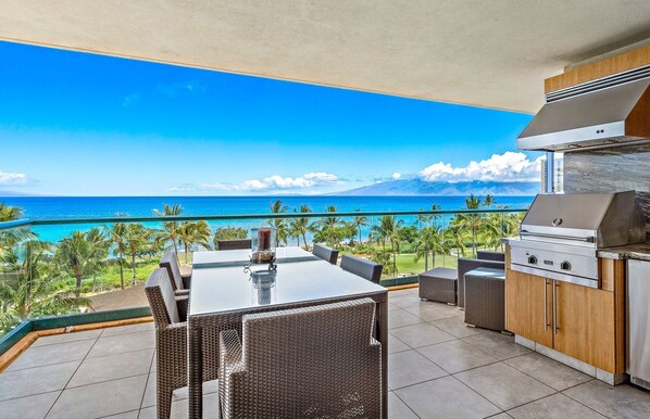 The generous combined 4,465 sq ft of interior living area provides ample room for family and friends to gather and reconnect, and the ample balcony space offers even more room to soak up the gorgeous Maui outdoors and take in the direct ocean views. The balcony of the 3bd has its own built-in Viking BBQ grill, offering the perfect setup for an outdoor group dinner.