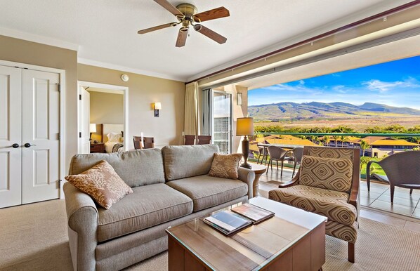 Konea 516 is a luxurious one-bedroom mountain view suite that enjoys expansive vistas of the West Maui Mountains. The suite is ideally suited to take advantage of some of the most beautiful sunrises anywhere. Coupled with frequent afternoon rainbows, you will cherish your mornings and also your evenings when the mountains begin to glow. To fully enjoy the warm Hawaiian breeze, fold away the glass doors to allow the relaxing interior to blend seamlessly with the outdoors.