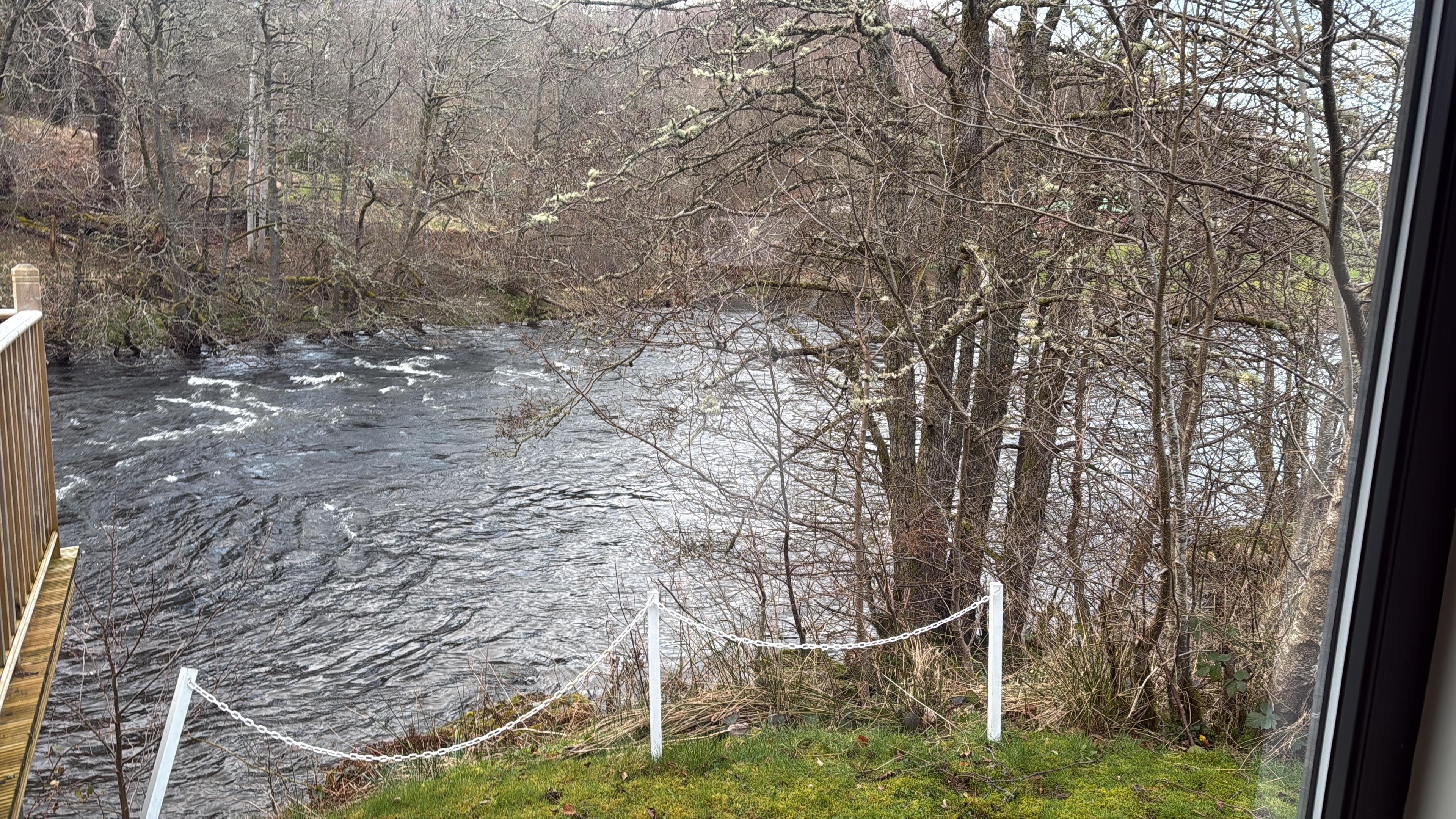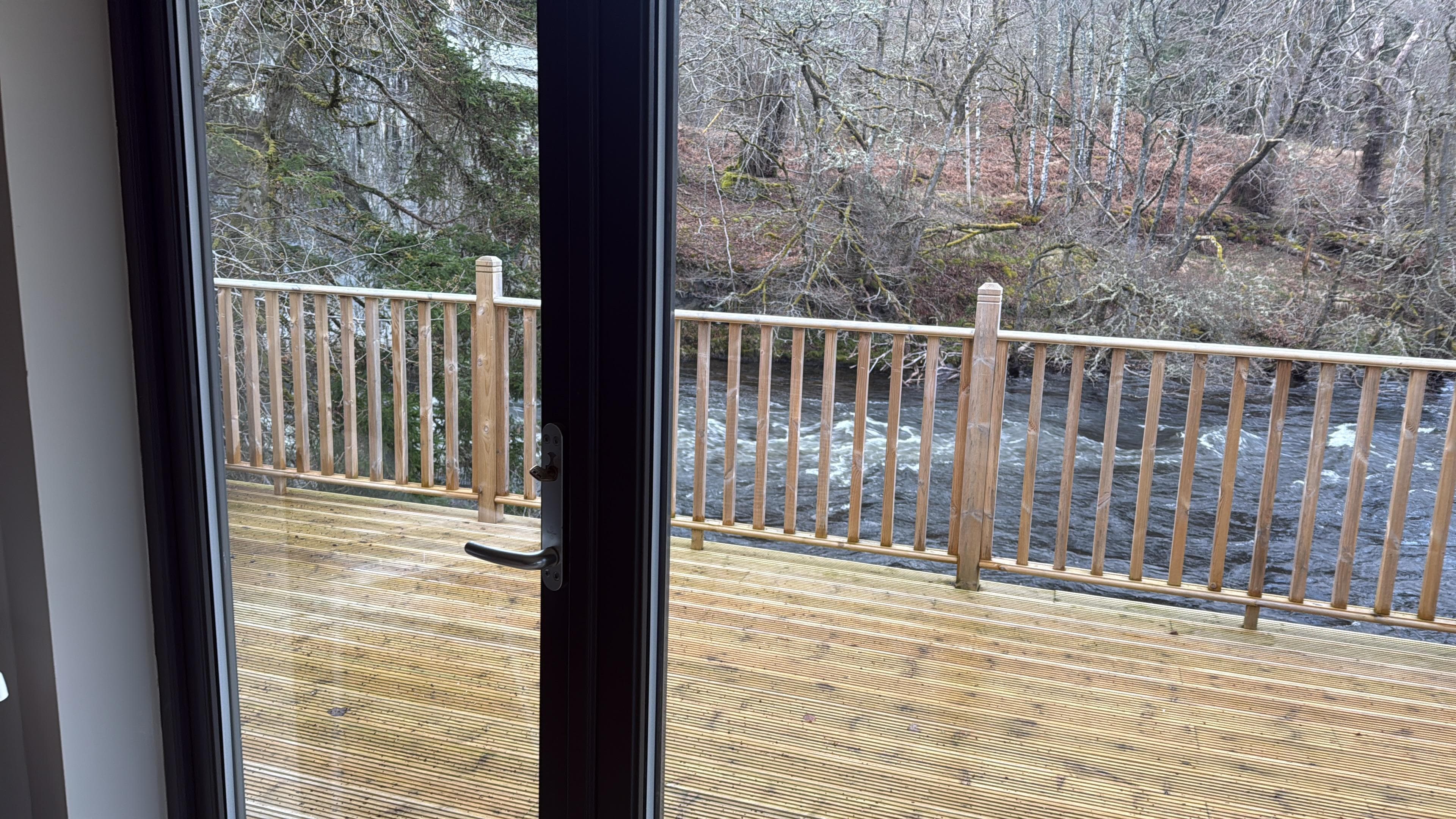 Outside, the private hot tub is set beside the river, offering a quiet place to relax and watch the water move past.