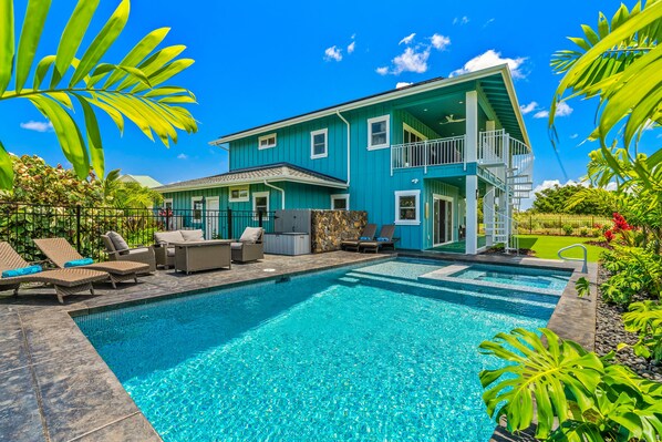 Come relax on our covered upper or lower lanai. Beautiful views of the mountains and golf course. Just off the living room is a sliding glass pocket door that opens the living area into the spacious upper lanai. You can sit in the living room and feel the cool breezes from the trade winds while watching tv on the 75" flat screen tv. The upper lanai has a BBQ Area with outdoor dining and seating. A spiral staircase takes you to the lower lanai which also has outdoor seating and a shuffleboard court. The backyard offers a lot of privacy with a 30-foot heated swimming pool and hot tub. We have another sitting area w/fire pit which is located next to the swimming pool. We have several options to relax and enjoy your vacation. We also have a game room which is sure to entertain all ages.