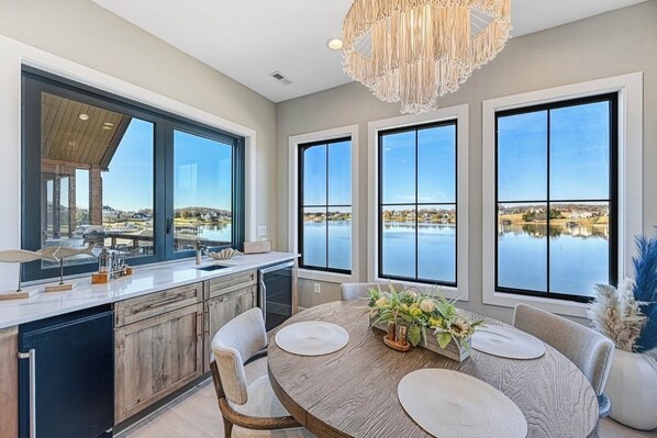 Private dock with two kayaks, a paddle board, Dining space, Smart TV, sundeck and fishing poles.
