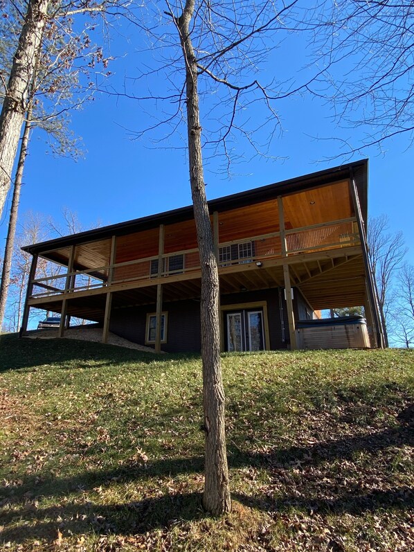 Relax in our secluded hot tub overlooking the pond with a glass of wine in Luray