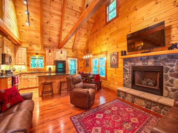 Take advantage of the spacious 38-jet Master Spa hot tub with room for 6 to 7 adults. Enjoy grilling and dining on the covered back porch. When you come back inside, there is a gas-burning fireplace that creates a natural ambiance with the flip of a switch. There are board games and cards and three high-definition Smart TVs with Spectrum high-speed internet, WiFi, and cable TV.