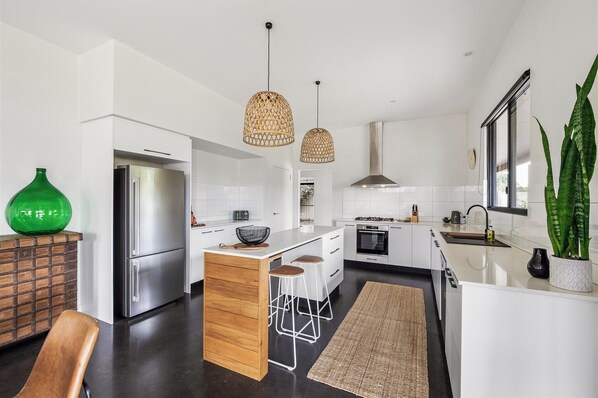 On the opposite side of the house, two additional queen bedrooms provide quiet comfort and style. These rooms share a sleek bathroom with both shower and bath. A separate toilet and a laundry with washing machine add convenience, especially for longer stays.