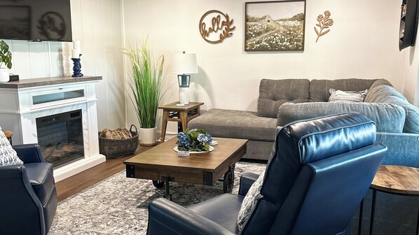A spacious and comfortable living room has enough seating for all, with a large, plush sectional, two recliners, a large TV, plus an electric fireplace for cool nights and a cozy atmosphere!
