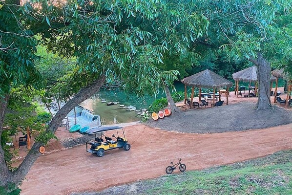 With a Deluxe Safari Cabin rental, you & your guests will enjoy the beautiful scenery & peacefulness of Son’s Rio Cibolo which features 2 miles of the gorgeous Rio Cibolo Creek with its blue spring water, and tons of activities including fishing, swimming & more!! After a fun filled day, sit ‘round the campfire at night & gaze at the big, bright, Texas starry sky! We are surrounded by large ranches which makes for a great outdoor get away from it all experience! Our Deluxe Safari Cabins are fully furnished, air-conditioned/heated and have everything you need to stay comfortable including foam mattress beds, linens and towels, kitchen, full bathroom, comfortable outdoor furniture, hammock, firepit, bbq pit & more! If you want to enjoy the great Texas outdoors without the setup and hassle of tent camping, while having all the creature comforts of home, our Deluxe Safari Cabins are for you! Deluxe Safari Cabins come with: 3 full sized beds with foam mattress and a futon couch. They also feature a kitchen, kitchen sink, with mini fridge, coffee maker, hot plate with pots and pans and blender. We do not provide silverware and dinnerware, so be sure to bring these, though linens and towels are provided. For inside entertainment and relaxation, guests will find a smart TV, WiFi & DVD player. Outdoor amenities include: comfortable wicker seating, hammocks, fire-pits, BBQ pits, picnic table, outdoor lighting, water and electricity. The unique design of our Safari Tent Cabin allows you to open up the entire back wall to enjoy an indoor/outdoor living experience, perfect for eating, relaxing and reconnecting with your friends and family. There are also 3 - 6-station bathroom trailers by our Safari Cabins (18 lockable, private, full bathrooms in total with hot showers) that you can use as well. We are lucky to have 2 miles of the spring-fed Rio Cibolo Creek for you to explore and enjoy! The Creek has never been known to go dry in this section and the water, being spring fed, it is nearly the same temperature year! The Creek varies in depth from 1 to 8 feet deep along our stretch, there are spots perfect for siting and cooling off or swimming. The fishing is fantastic too with large catfish and bass! Families and friends spend countless hours here swimming, kayaking, relaxing, and having fun, in and along the banks of the Rio Cibolo Creek! Son’s Rio Cibolo has lots of amenities off the creek too to enjoy as well, including: 3 pools, 4 hot tubs, basketball court, volleyball court, horseshoe pits, game room with pool table, shuffleboard, foosball, ping pong table, air hockey, horseshoes and more! At night, each cabins has their own firepit so guests can hang out around the campfire under the stars, roasting marshmallows and having fun. There are also many picnic tables, BBQ pits, hammocks and comfy furniture located throughout the property to make your stay as enjoyable and relaxing as possible. We have live-on-site staff to help with anything you may need during your stay. Located on 100 acre nature resort with 2 miles of creek frontage! Guests can park right next to their cabin. Everything is within walking distance but guest can opt to drive as well.
