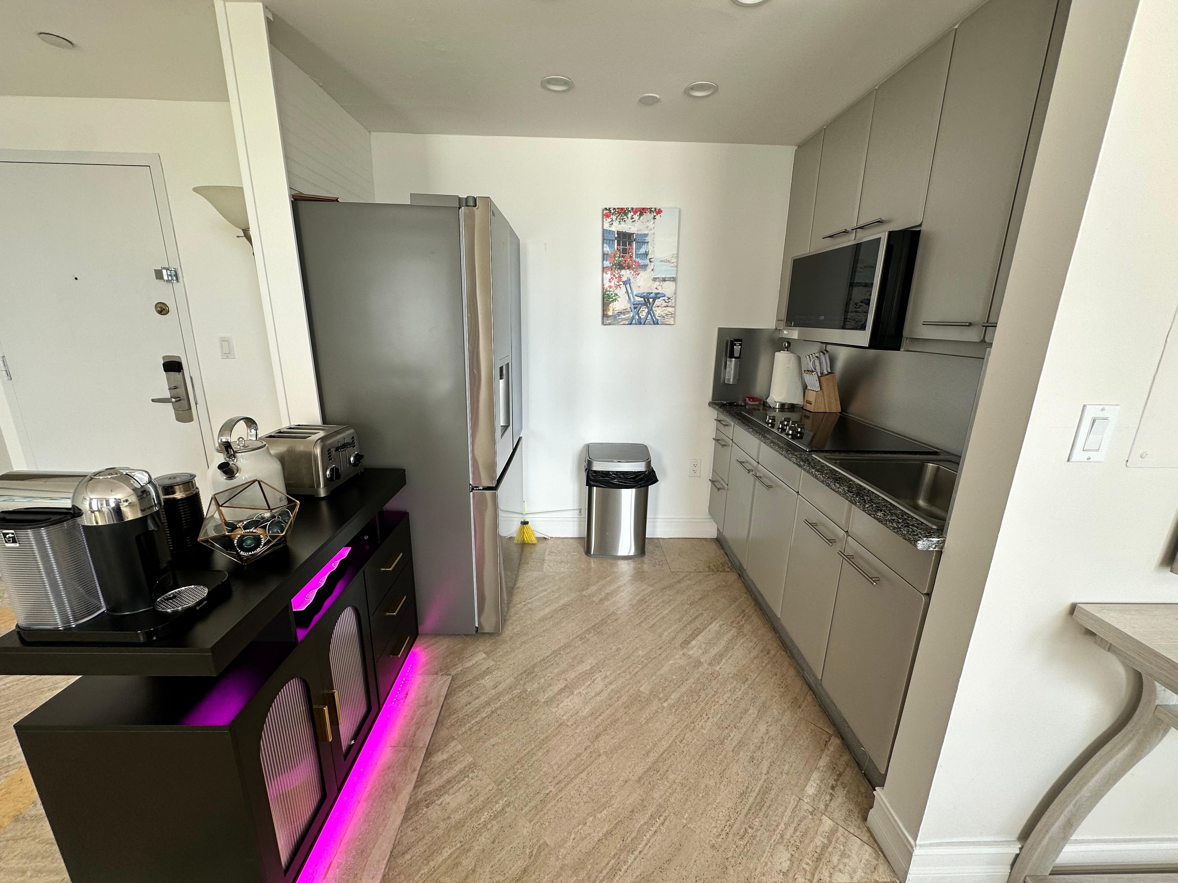 We have stayed at the Hilton Bentley Hotel in previous years. The hotel seems overpriced but, for us, a staid married couple in our 70’s, it’s all about the location. It’s pretty much the only beachfront hotel south of Fifth St. (Sofi) where the scene is much more civilized than Ocean St. north of Fifth. So this lovely privately-owned suite on the 8th floor of the same facility was perfect for our two-week stay. By renting privately and sacrificing just a few of the hotel’s services and amenities, we were able to save quite a bit. The hotel staff, though not beholden to us, were very pleasant and professional. The wifi really is a bit sketchy, so if you want to stream movies or work uninterrupted, Hilton offers a $14 p.d. wifi upgrade. And although we were disappointed that this unit lacks a balcony and the windows are screwed shut, we were able to find fresh air and tranquility on the 4th floor spa area where there are chaises and usually very few people. But this is not to minimize the fact that this suite has a wonderful view of the beach. Sitting by the window sipping our morning coffee while watching surfers and the joggers on the beach walk is beyond pleasant. Since we were staying for 14 nights, I was concerned about how we would have fresh towels etc. No worries—There is a self service laundry on the second floor available for all guests’ convenience. On the 4th floor we had the use of a perfectly adequate gym. And as for this unit, rented from a private individual owner, we were pleased and impressed to find that it was in pristine condition. The suite must have been very recently repainted and the elegant furniture all looks brand new. (Hopefully it won’t soon be scuffed up by careless families with rambunctious children, the likes of which we curmudgeons noticed daily at the pool 😉). The minimal kitchen area and the very basic utensils suited our lifestyle just fine. There is a full size fridge, a basic coffee maker, an ice cream scoop and a corkscrew. That’s all we needed…..(Although I did have to buy a sharp knife). Joe’s Stone Crab TakeAway is right around the corner so it’s easy to order-in and then eat at the dining table while watching the cruise ships depart. Santorini downstairs is a very good restaurant located around the pool area. All in all, I will give this vacation/rental experience a 5-star review!