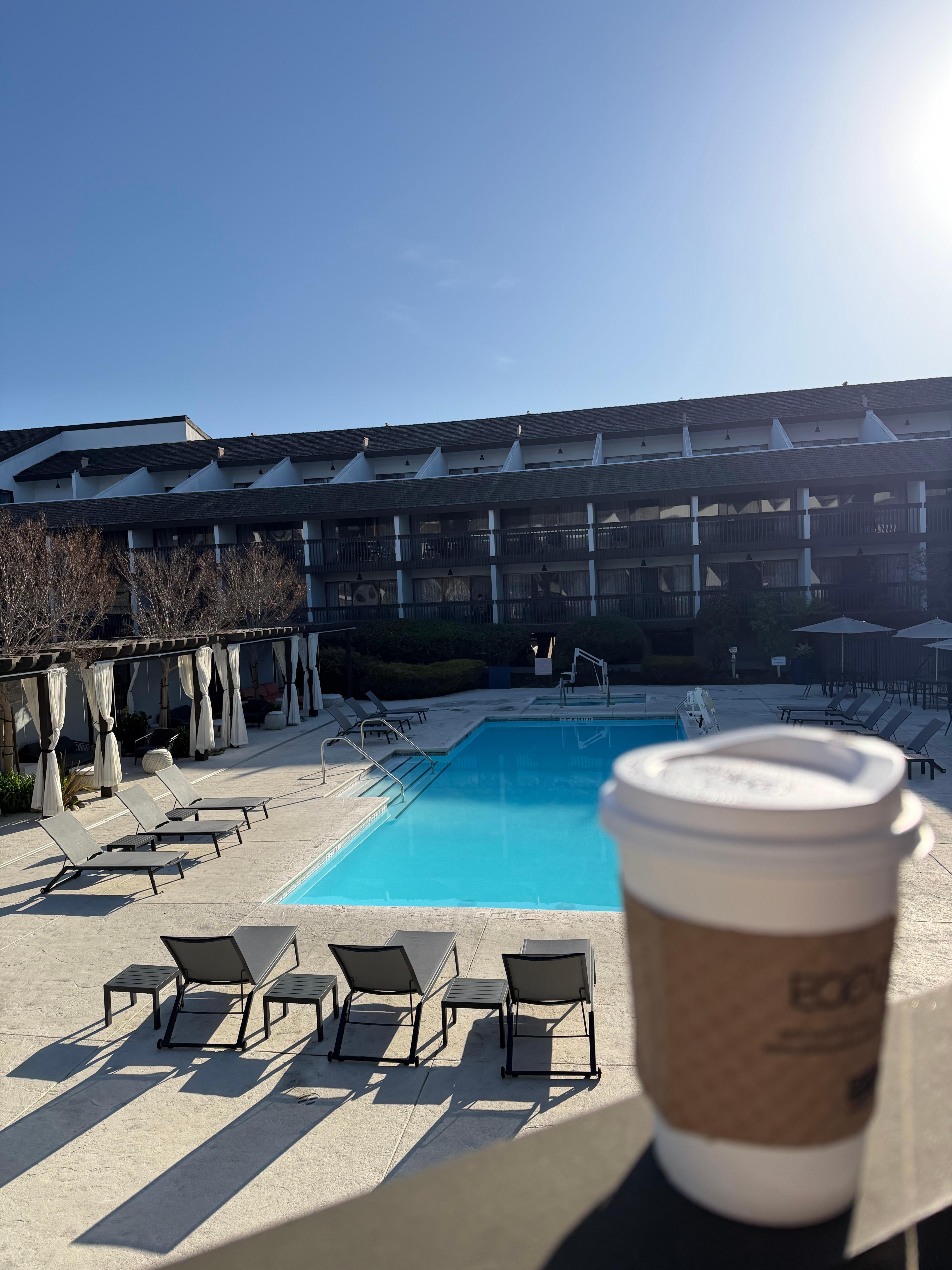 Travelers gather around the outdoor firepit at this modern Monterey Bay hotel, where the helpful staff ensures a memorable stay by the pool