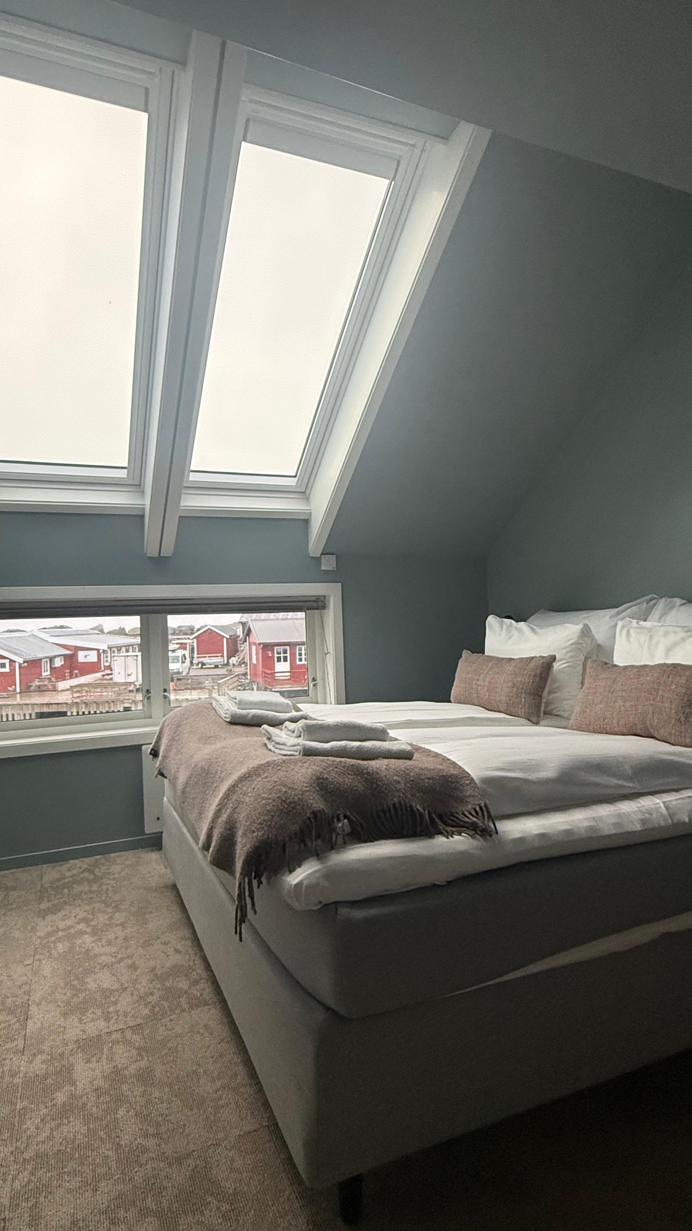 The room was excellent. The location was amazing. This was the anchor stay for a five day trip through the Lofoten Islands. Because it was a Sunday during the shoulder season, we “checked in” via a box with our key in an envelope. This was actually really easy. The individual room we stayed in, room 10 above the restaurant was great. There was a sink in the room, but we had to use a shared shower. This wasn’t bad at all. The shared bathroom was very clean. I don’t think there were many other guests. The weather leading up to our stay was cloudy and pouring rain with rain gusts up to 50 mph. Luckily, it cleared up shortly before 8pm and we were able to catch the aurora. It was amazing! Great location, great place, and great views!