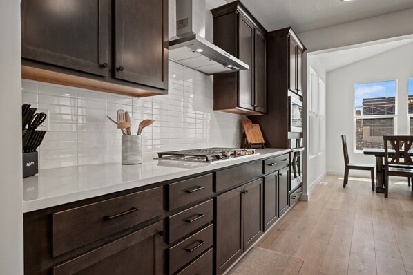 The kitchen is fully equipped for everything from casual meals to holiday feasts. It features brand-new appliances, including a gas stove, oven, microwave, dishwasher, and refrigerator with an ice maker. A large island with seating for six makes it easy to entertain, and the cabinets are stocked with all the essentials—dinnerware, wine glasses, serving bowls, cooking tools, spices, a Keurig, 12-cup coffee maker, toaster, air fryer, crockpot, blender, rice cooker, hand mixer, and more. Just off the kitchen is a mudroom near the garage entrance, where you’ll find a Pack ’n Play and highchair for families traveling with young children.