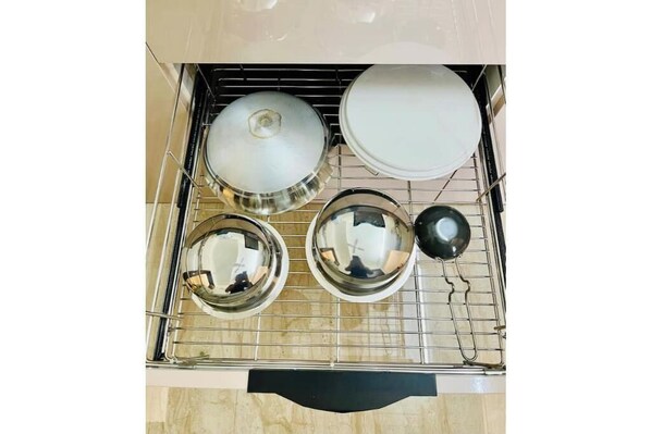 Ideal for long-stay guests, the apartment features a proper kitchen complete with a gas stove, microwave, refrigerator, water purifier, and all the basic utensils and crockery you’ll need to cook your own meals.