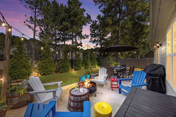 ☀ Spacious fenced backyard w/ firepit, Adirondack chairs, and café lights
