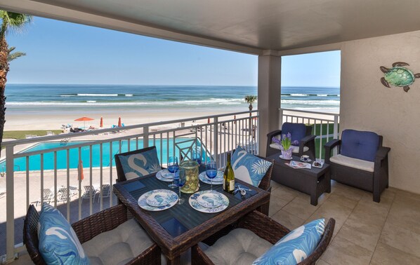 Outdoor dining - Sandpiper-Lovely direct beachfront condo ~ SP305 (New Smyrna Beach)