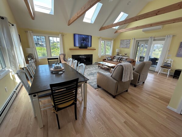 First floor includes a sunny kitchen with all usual amenities including an electric stove, microwave, dishwasher, fridge and a large island with plenty of storage and counter seating. The newly constructed open floor plan dining/living/family room combination includes new hardwood oak floors, multiple skylights, vaulted ceilings with ceiling fan, AC mini-split, gas fireplace, 65" TV with soundbar, a leather couch and two leather recliners, and dining chairs for 8. The first floor den/small living room has newly-sanded oak hardwood floors, a comfortable couch which seats 3-4, two large upholstered easy chairs and a rocking chair. There is also a 42" Samsung Smart TV. Also on the first floor is a sunny full bath with tub and shower unit, and a carpeted bedroom with AC, including an oak frame double bed, and a twin bed and two small chairs.